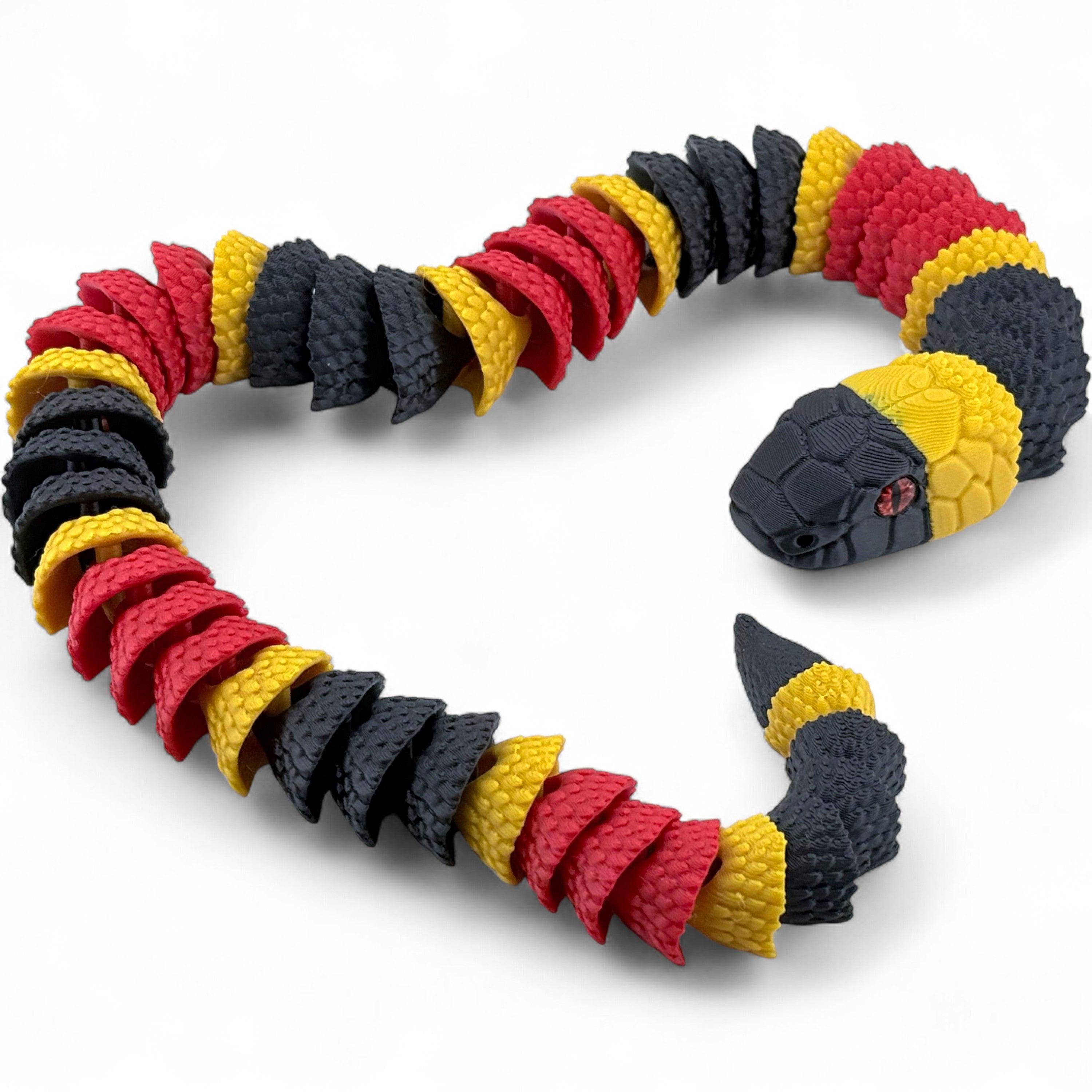 Each snake features the classic red, yellow, and black color pattern, brought to life with high-quality PLA+ and strengthened American-made plastics. Realistic glass eyes give it an authentic, vivid expression, while the flexible segmented body mimics real serpentine movement.