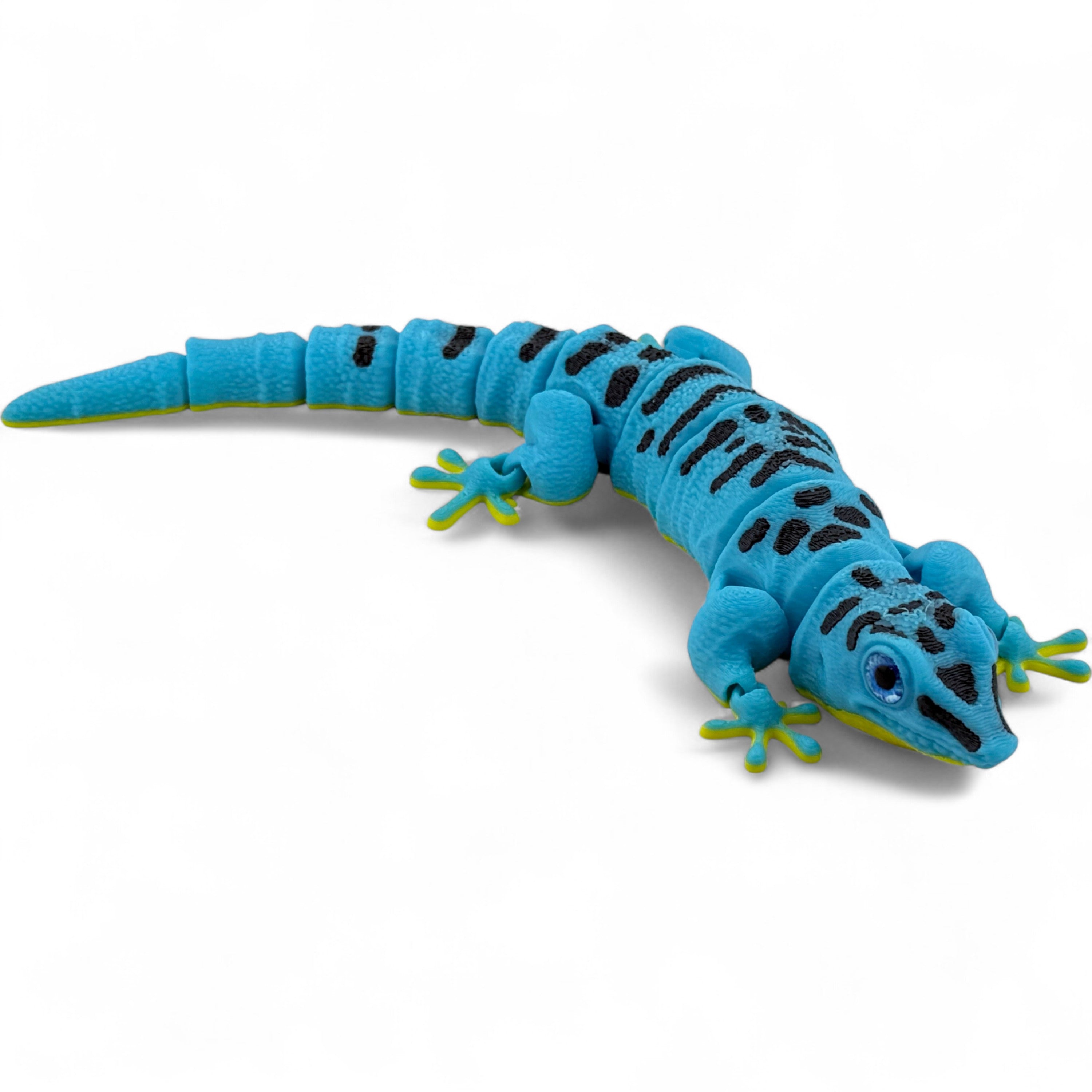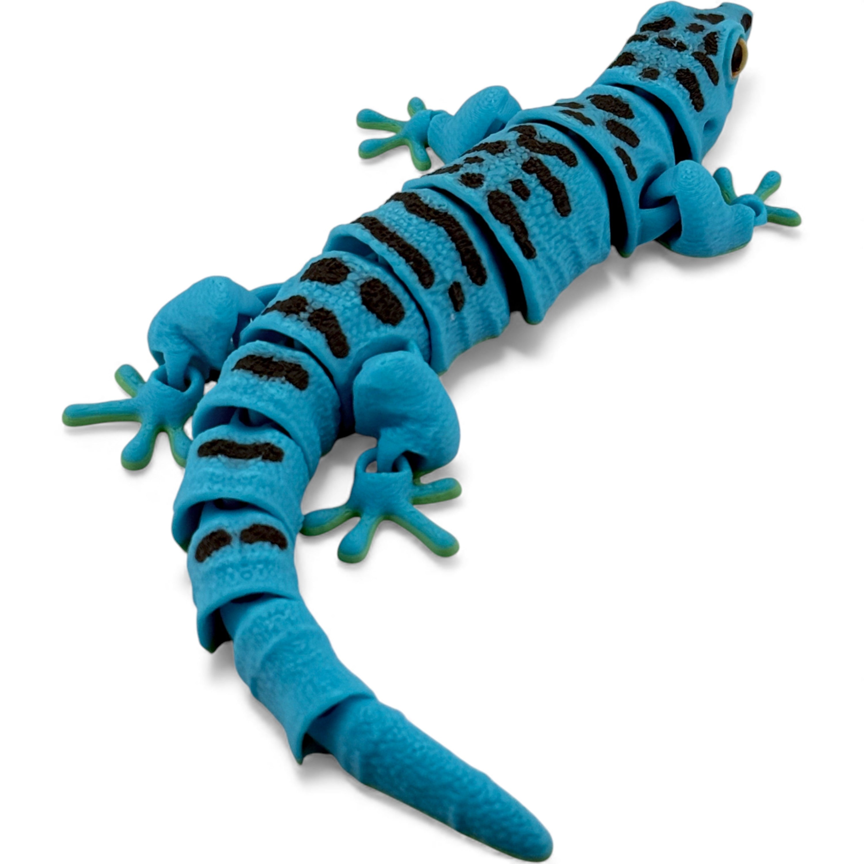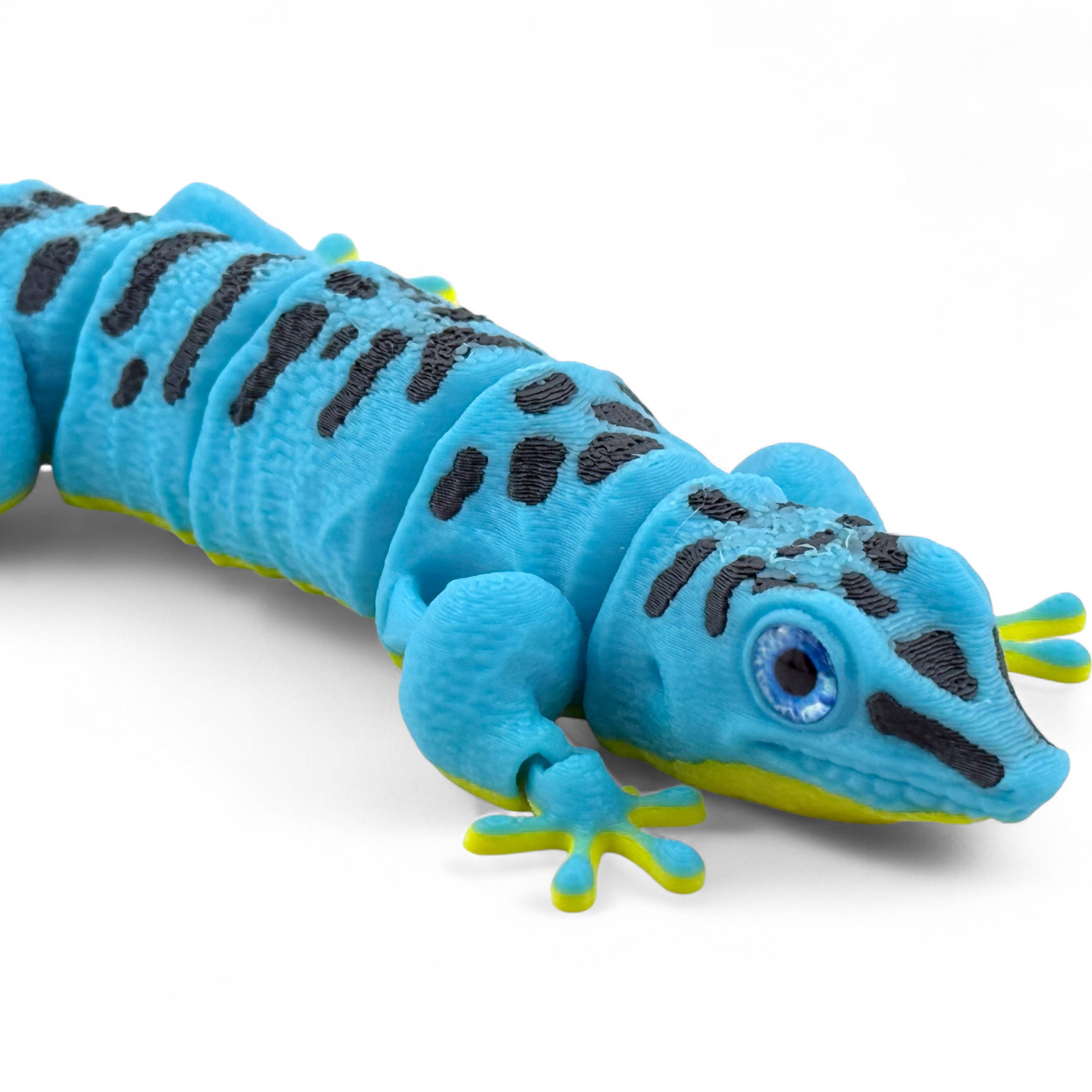 3D Printed Flexi Giant Day Gecko with Realistic Glass Eyes – Sky Blue with Full Body Black Markings