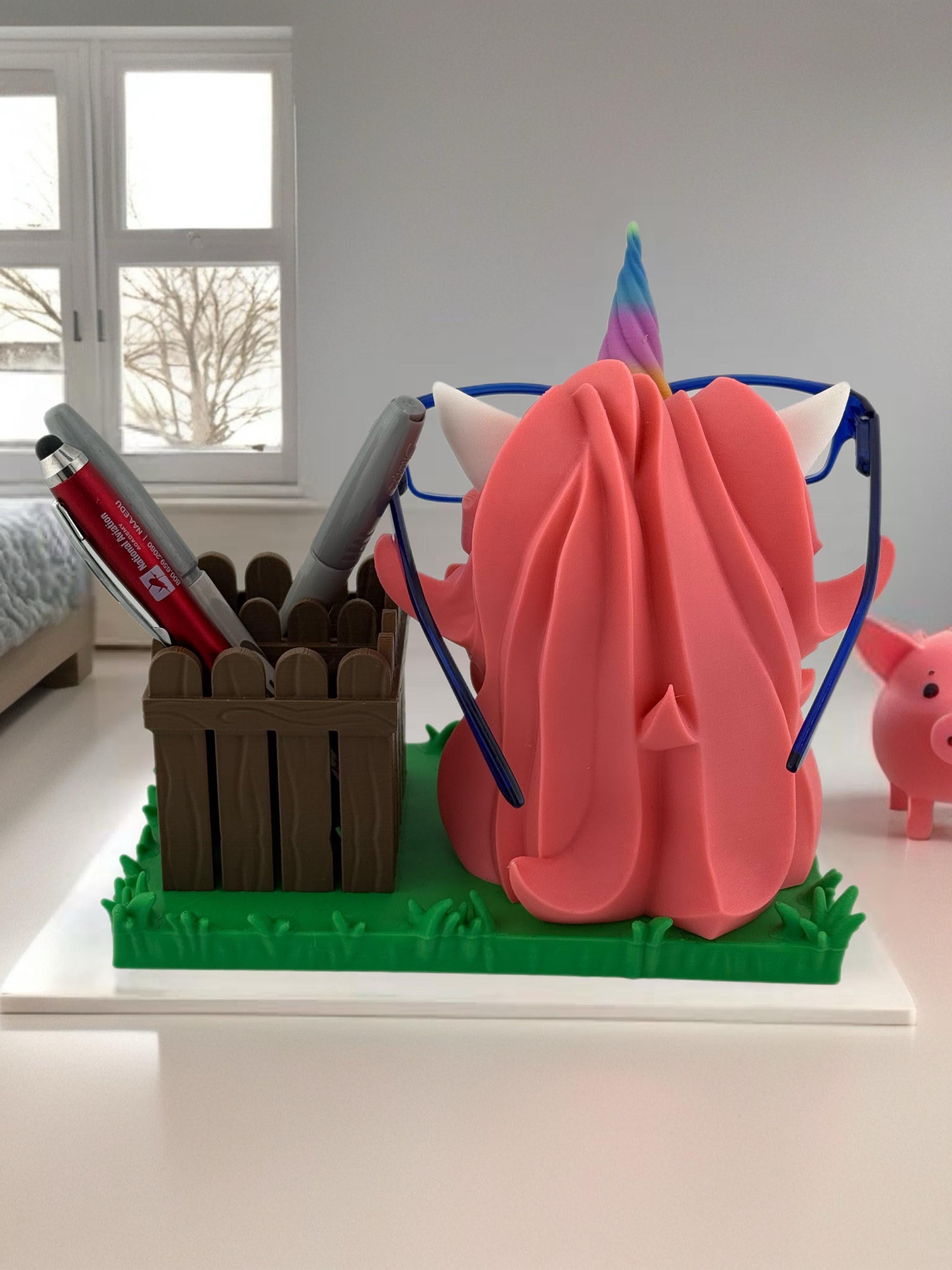 Bring a touch of magic to your workspace with this 3D Printed Unicorn Glasses Holder & Pencil Cup. Designed with both charm and practicality, this piece doubles as a whimsical eyeglass stand and a desk organizer, keeping your essentials close while adding a bit of mythical flair.